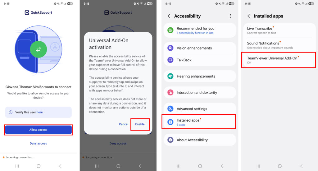 Phelcom uses the QuickSupport app for remote technical assistance. To allow us to perform necessary maintenance on your equipment, we kindly ask you to open the App and authorize our connection. Samsung has disabled accessibility in Android 15 and upcoming versions, requiring users to enable them manually. Without these permissions, we cannot remotely access your equipment for maintenance.
