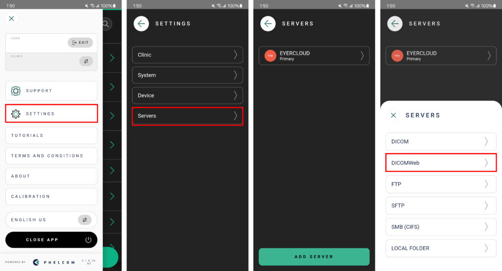 3. Press the “Add Server” button and choose the appropriate server type (e.g., DICOM Web).