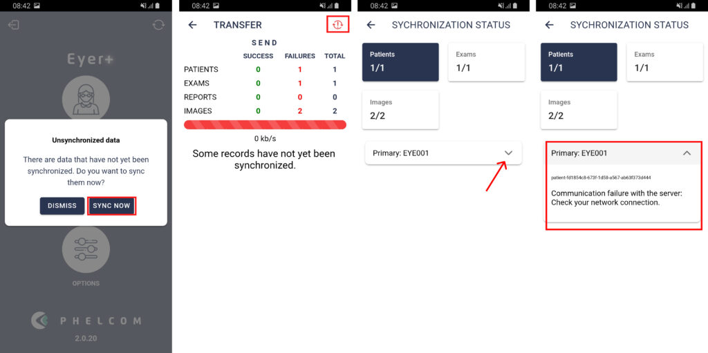 Synchronization issues occur when your device is unable to send images to the cloud or another server. This failure can appear due to different reasons, and If appear, contact technical support to instruct you about what to do: