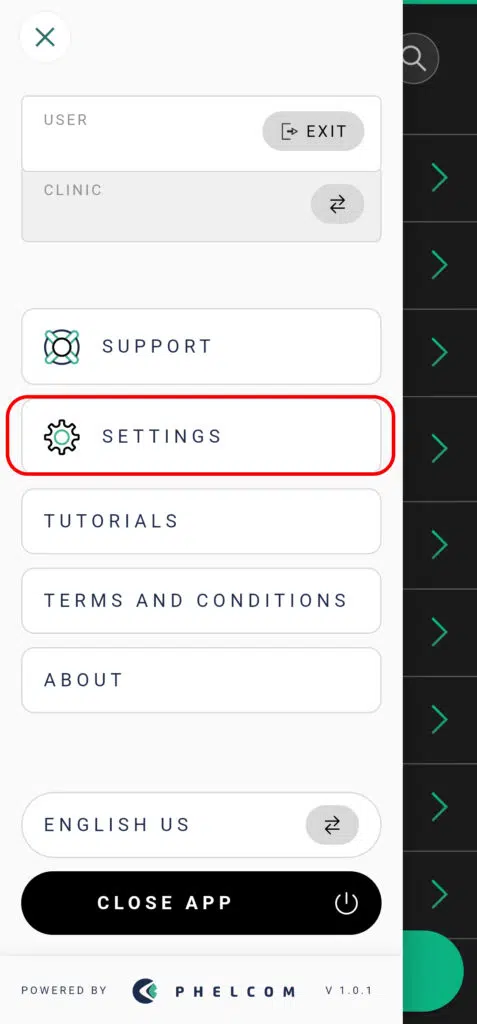 You can alter the system preferences in the Eyer application, such as the laterality of the picture when the camera is started, or the default fixation target. To do this open the side menu by clicking on the icon on the top left, select: