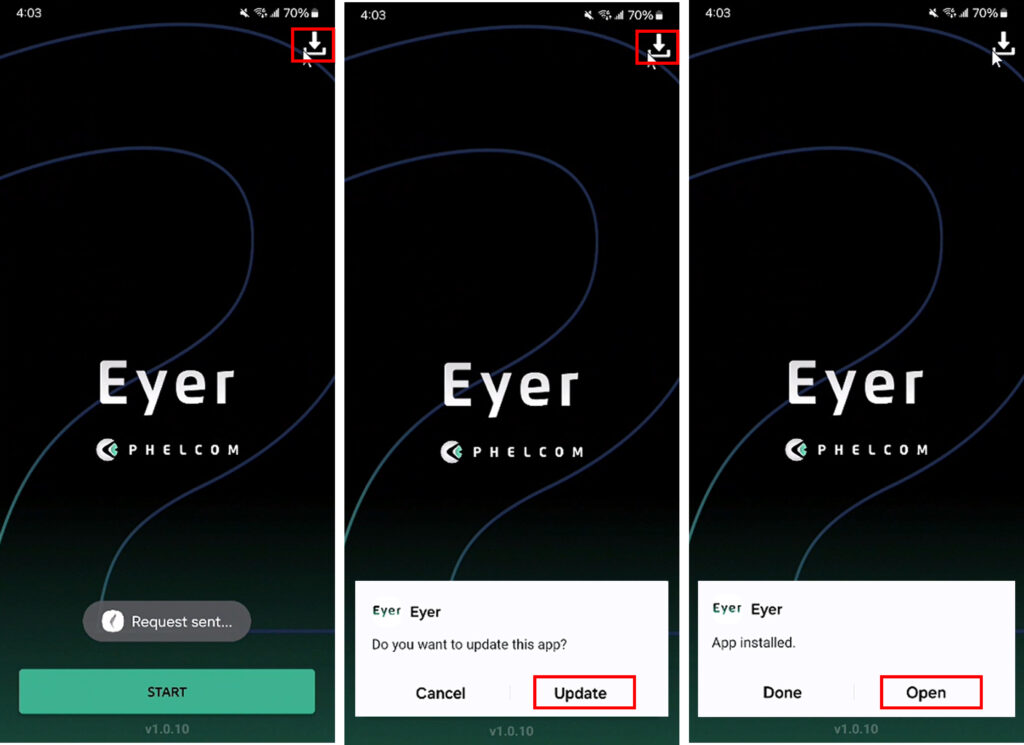 The device will guide you to complete the installation. To confirm the update is finished, check the version numbers on the initial screens in the bottom corner. If they’ve changed, your Eyer is now updated!