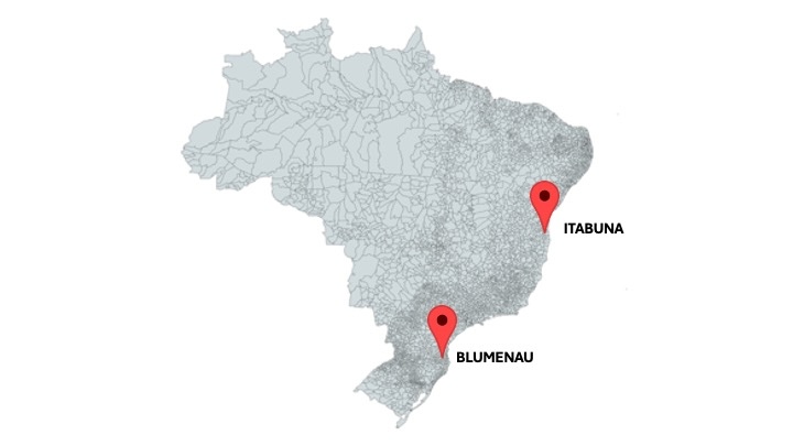 Mapa destacando Itabuna (BA) e Blumenau (SC), cidades onde as amostras de pacientes foram coletadas.