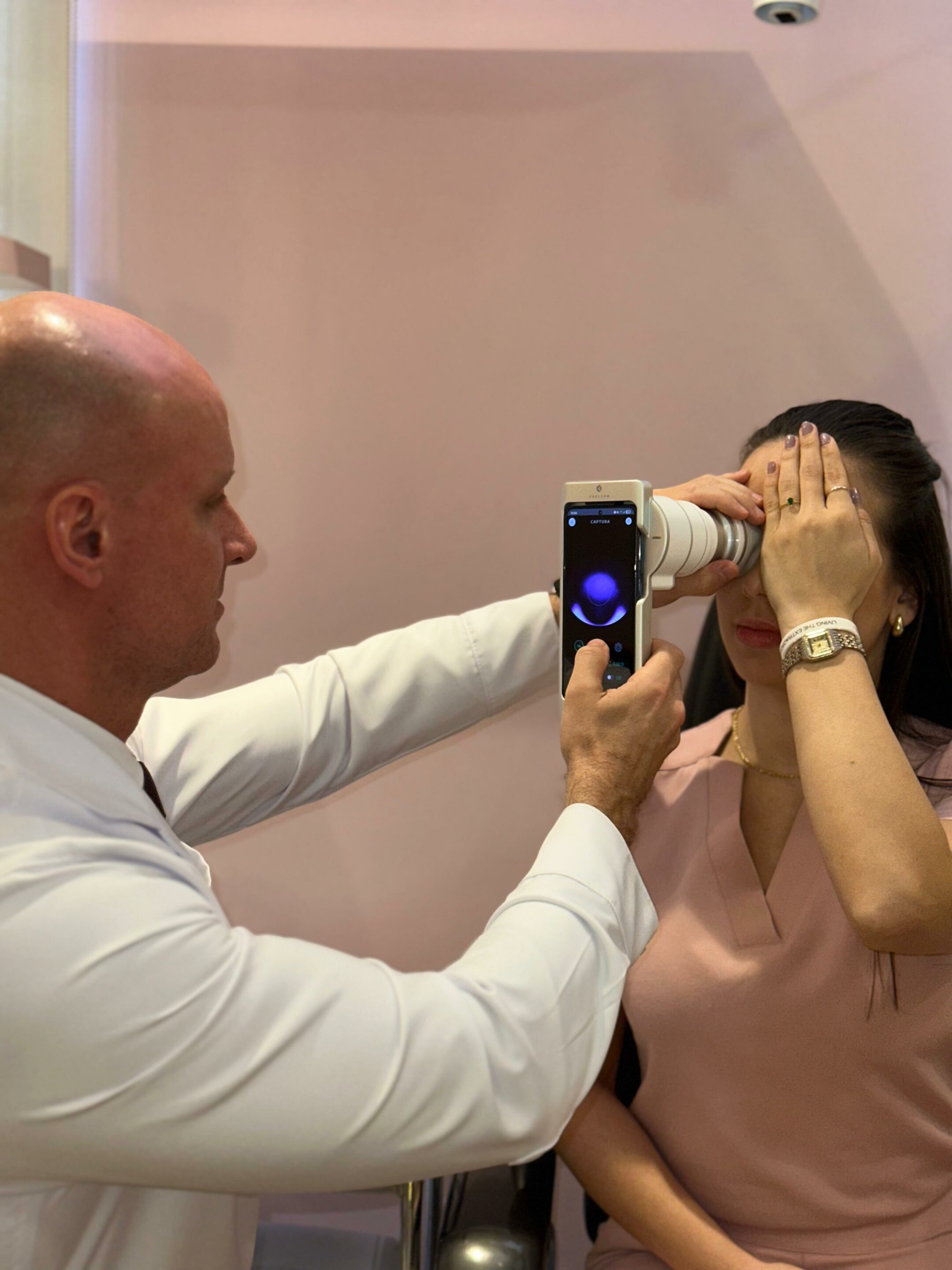 Na clínica, um tecnólogo de saúde é responsável pela captura inicial das imagens antes da consulta. Já o Dr. Gubert realiza avaliações mais específicas, como meibografia e exames com fluoresceína, também para manter o contato direto com os pacientes. Além disso, o equipamento permite retinografias sem necessidade de dilatação, otimizando o processo.