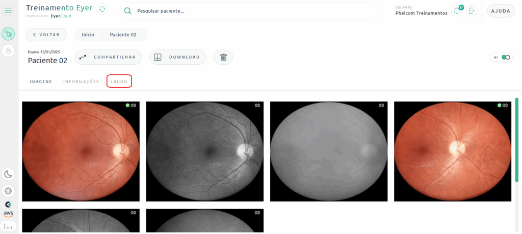 Se estiver usando a visualização em LISTA, você terá acesso ao ícone de PDF na lista de exames, que permite baixar as imagens diretamente para o seu computador.