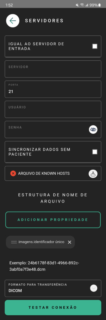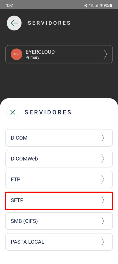 O Eyer permite o compartilhamento de exames através de um servidor SFTP (SSH File Transfer Protocol). O SFTP é um protocolo seguro para transferência de arquivos que utiliza criptografia SSH para proteger os dados durante o envio. É a opção recomendada para garantir a privacidade dos dados dos pacientes ao sincronizar o Eyer com o seu servidor local.