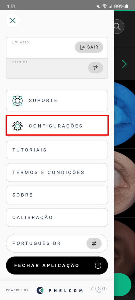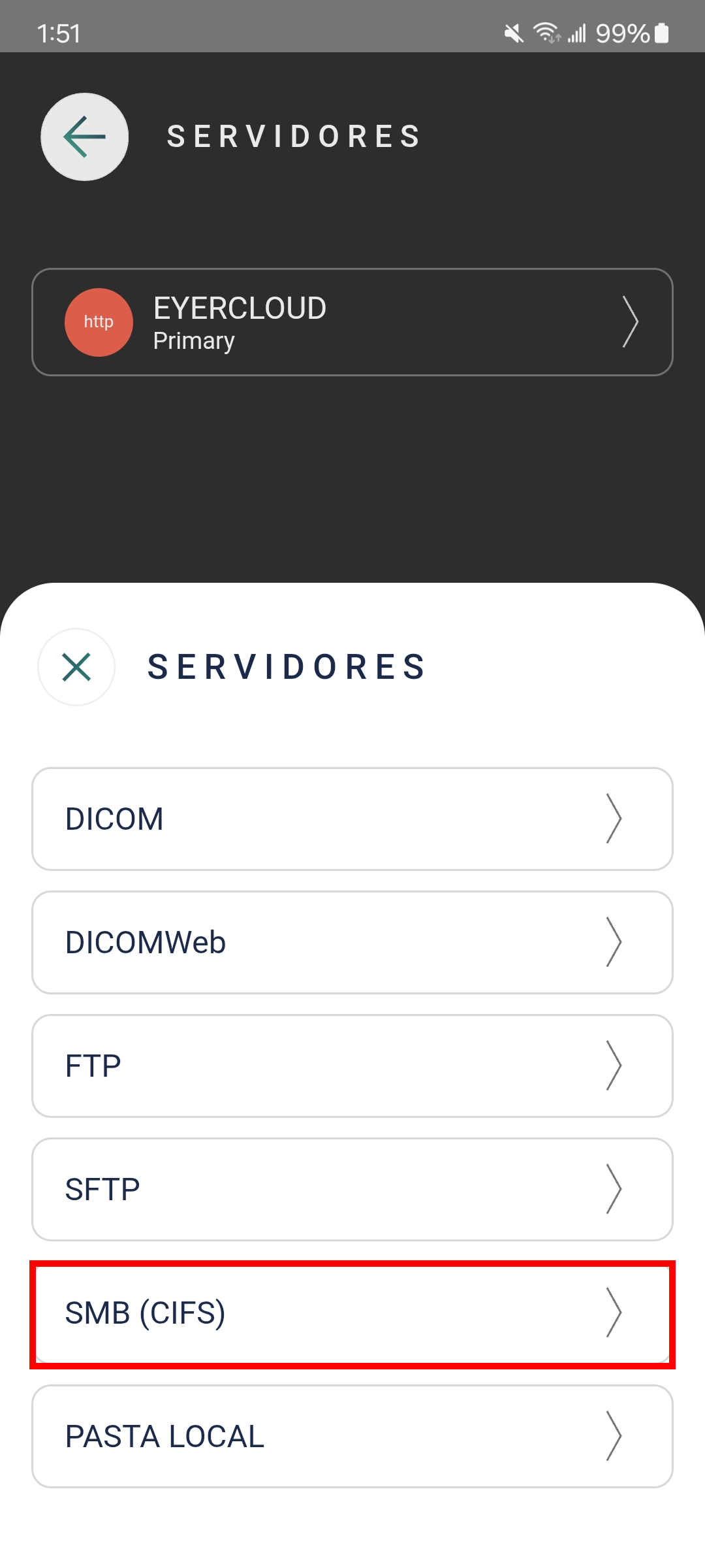 As imagens capturadas com o Eyer são enviadas para o Eyercloud, plataforma em nuvem nativa do Eyer ou podem ser enviadas para um servidor externo por meio do protocolo DICOM. Para realizar a configuração do servidor DICOM em seu Eyer, abra o menu lateral clicando no ícone no canto superior esquerdo, abra as “Configurações“, “Servidores”, aperte o botão para adicionar novos servidores e selecione SMB.