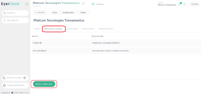 Uma página com os dados será exibida, aperte em “Templates (Laudo)” e em “Novo Template”.
