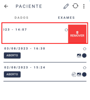 Para habilitar a opção de exclusão, arraste o dedo da direta para a esquerda no exame desejado e selecione “Remover”.