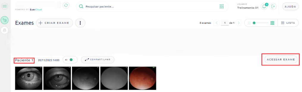 Para excluir uma imagem, localize o paciente e clique em “Acessar Exame“. As imagens capturadas serão exibidas em miniatura.