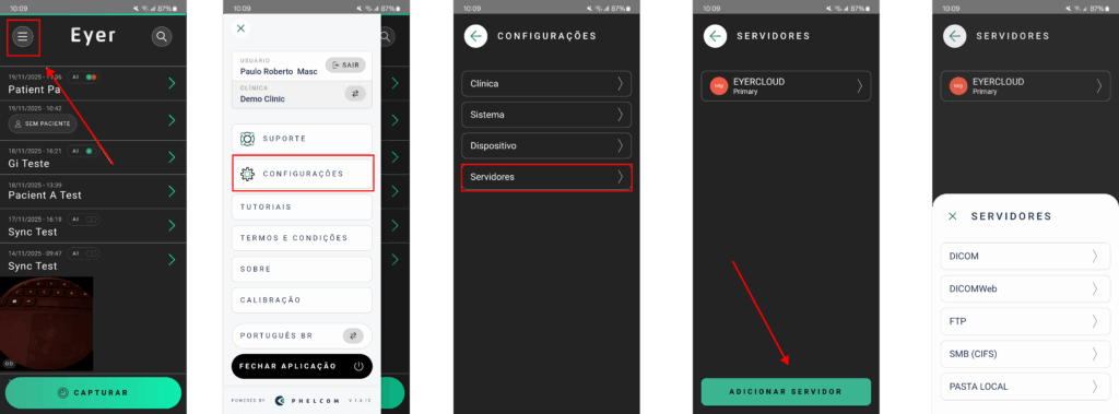 Para acessar e gerenciar os servidores do dispositivo, ou visualizá-los, removê-los, adicioná-los ou editá-los, siga os passos abaixo: