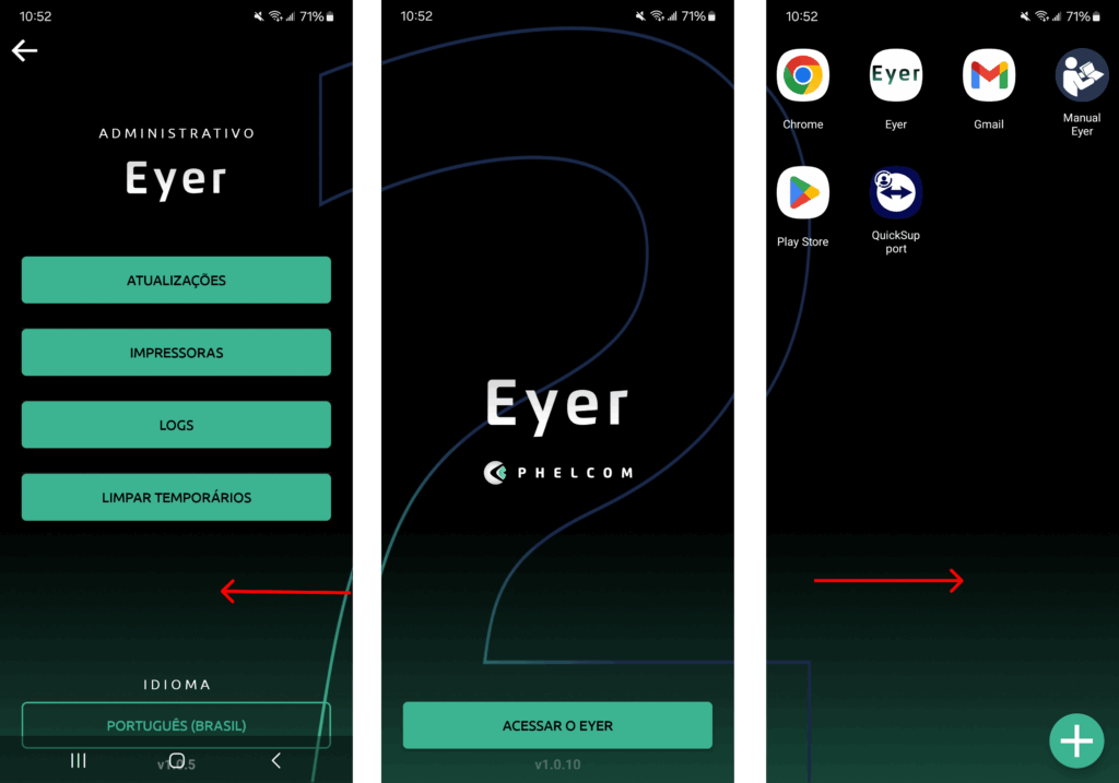 É por isso que você deve sempre ter o Phelcom Launcher definido como o aplicativo de inicialização padrão no smartphone Eyer. Em outras palavras, a tela inicial do seu equipamento deve sempre ter a aparência das telas abaixo: