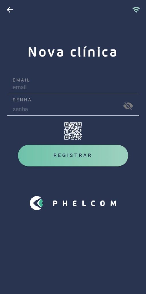 No seu dispositivo, Eyer, clique no ícone do código QR na tela de login e a câmera será aberta. Leia o código QR exibido na tela do computador e uma nova clínica estará disponível para uso no seu dispositivo.